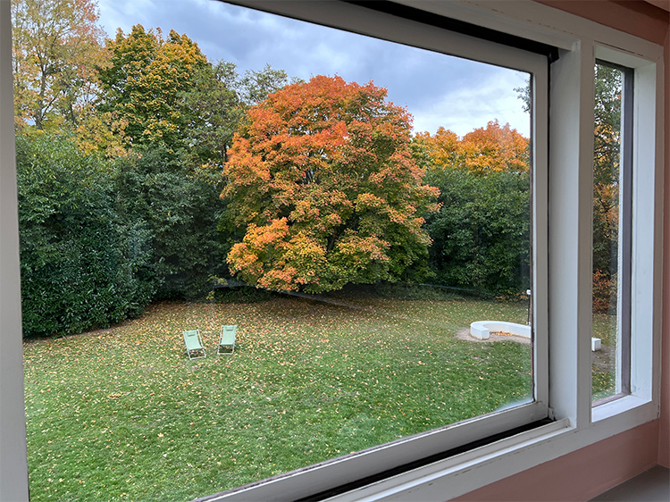 建物にぐるりと設けられたガラス窓からの自然の景色の