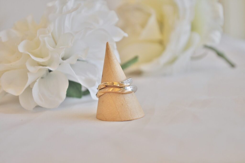 マリッジリングとの重ね付けをした時のラインも美しく、指との馴染みが良いのもポイントの一つです。