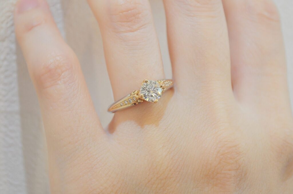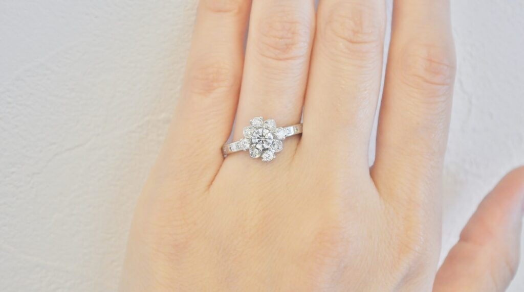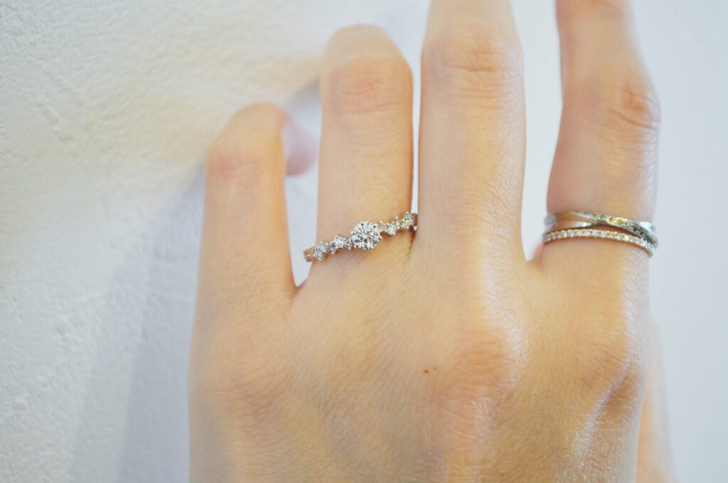 センターのダイアを際立てつつ、程よく周りのメレダイアも光る落ち着きも感じられるデザインなので