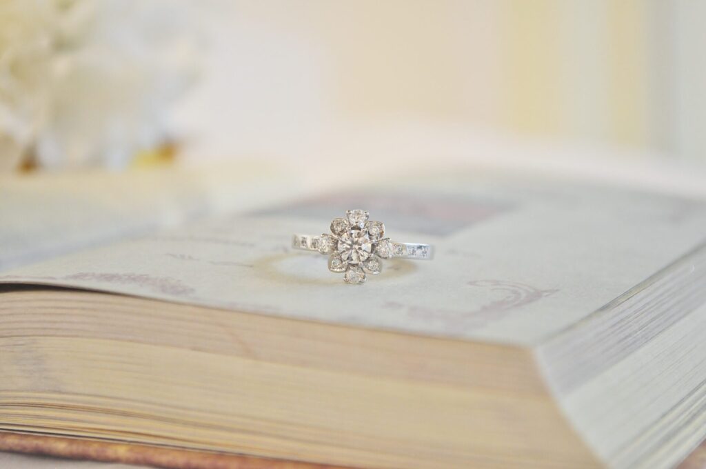 センターのダイアを引き立たす周りのダイアの輝きできらめきに包まれるデザイン*