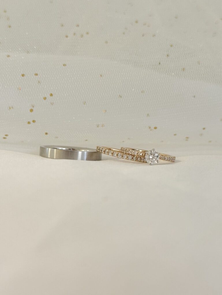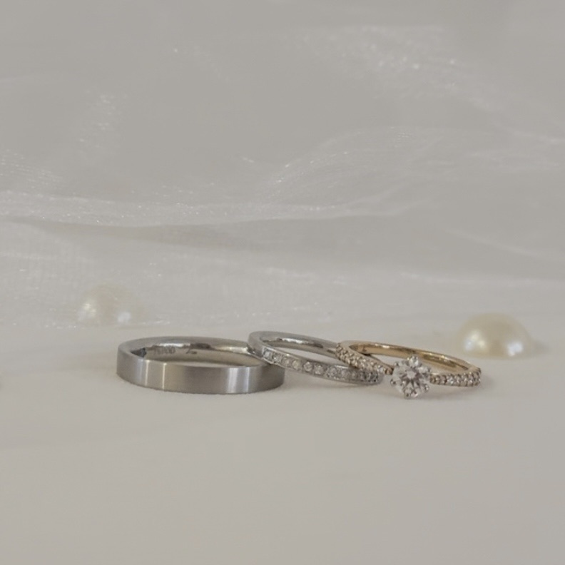 シンプルなストレートの結婚指輪を合わせたスタイル。