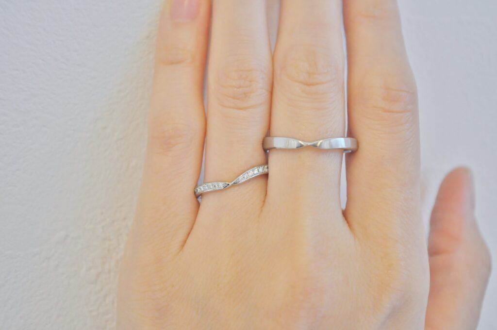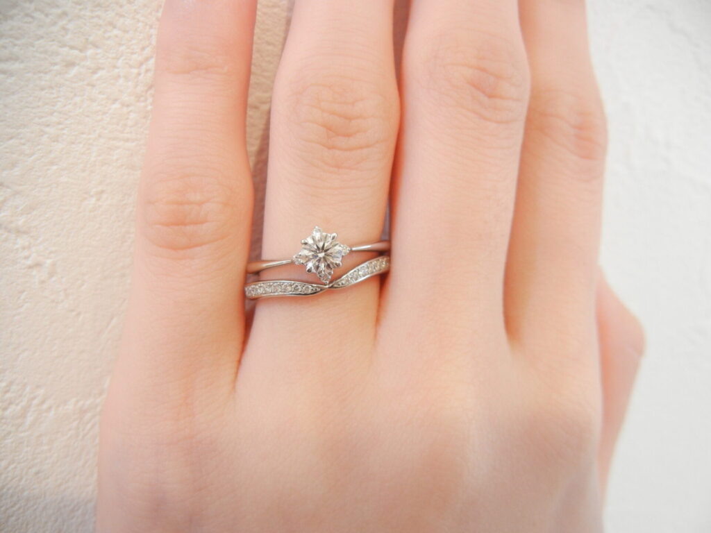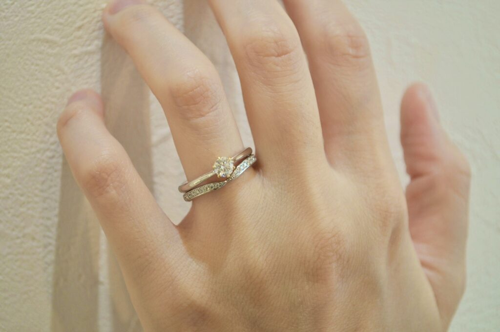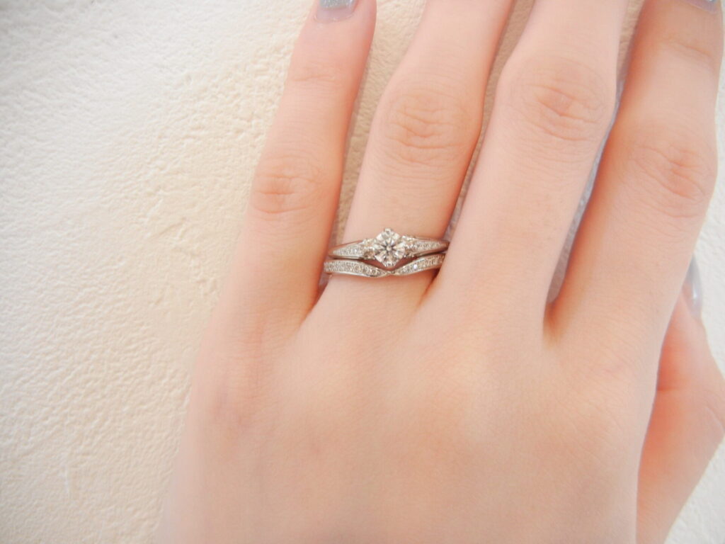 センターダイアモンドの所から横にかけるにつれて段々とシャープになっているデザインで重ね付けをしてもバランスが良いです♪