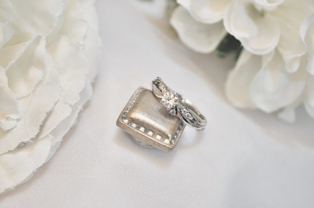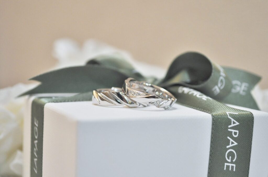 婚約指輪と結婚指輪を重ね付けするとぴったり綺麗にはまるのが特徴的なセットリング。