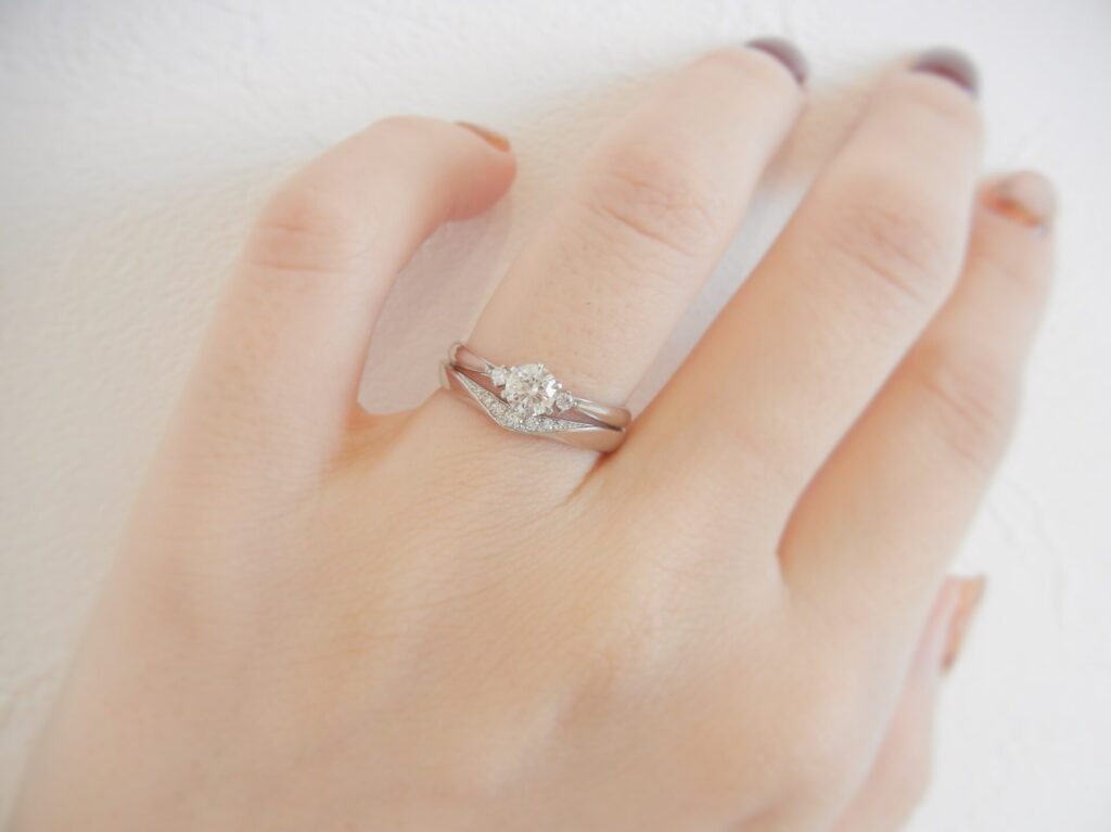 センターダイアモンドの両サイドに寄り添うメレダイアモンドが輝きを添え、リング全体をきゅっと引き締めてくれます。