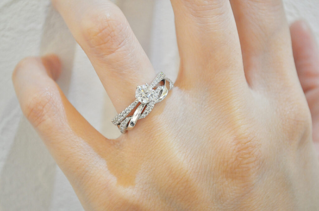 セルジュ(結婚指輪)はねじりの中に透かしもあり、重ね付けをしても重すぎない組み合わせです*